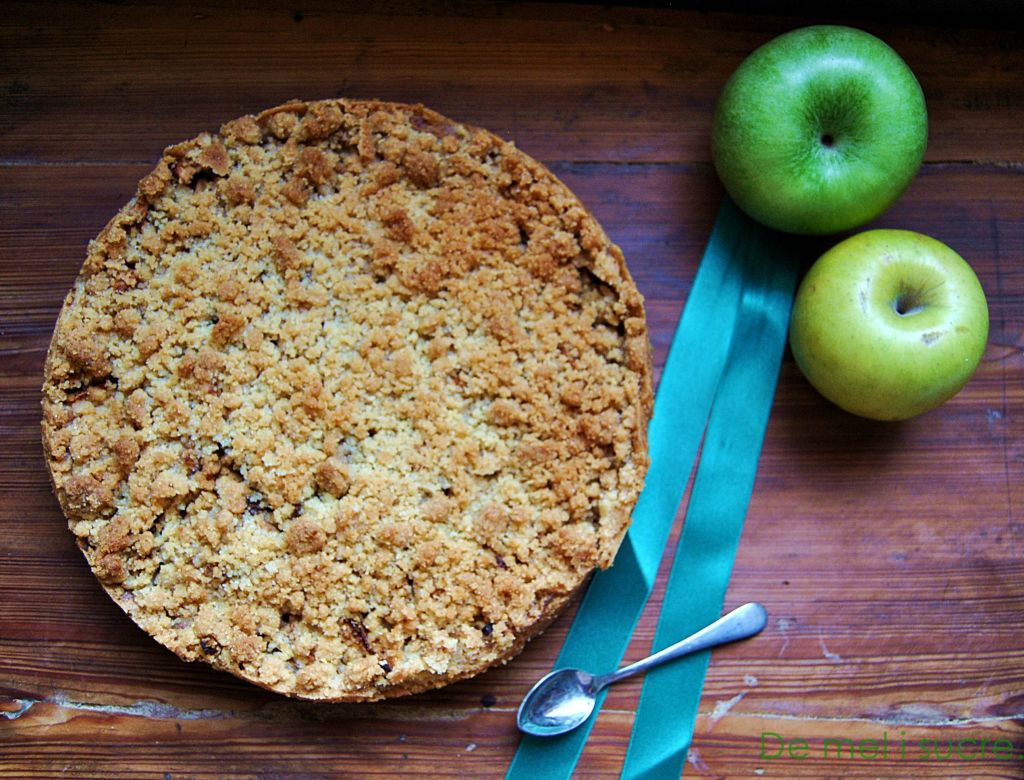Jo adjuntaré la recepta tal com la faig. Però puntualitzaré, que l’original du llavors de fonoll (que no ens agraden massa, ni a jo ni a l’Ana i no n’hi posam) i que no porta ‘cumble’ o ‘kruimels’ que diu ella (la cobertura grumosa) sinó que es fan tiretes i queda un reixat. Això ho podeu fer al vostre gust. A mi m’encanta acompanyar-la d’una crema anglesa, o una crema pastissera clara, i afegir-hi una mica d’ametlla mòlta al cumble.